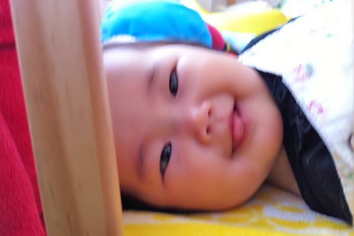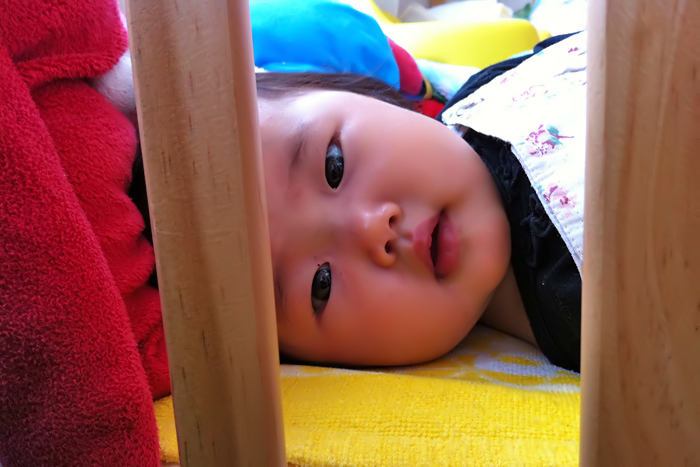 ふと気付くと、ベビーベッドの隙間からこちらを見ている。